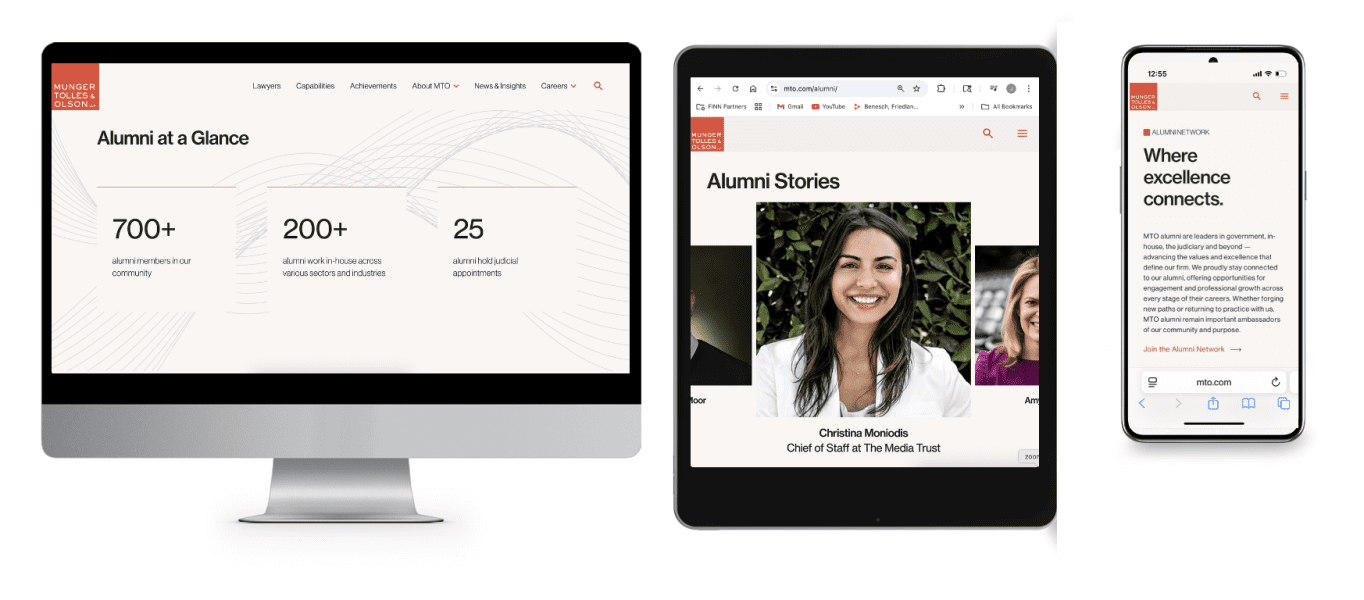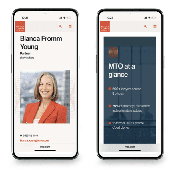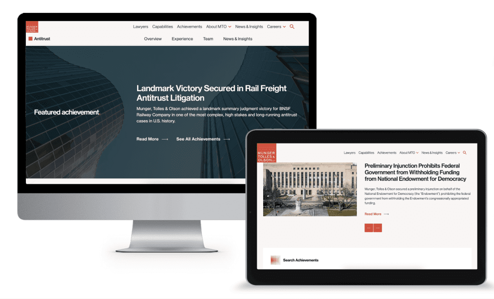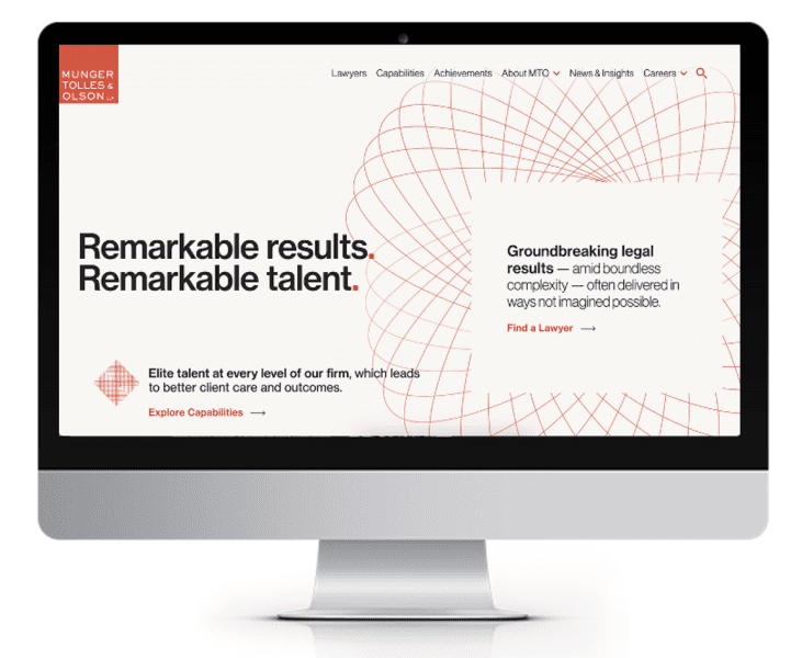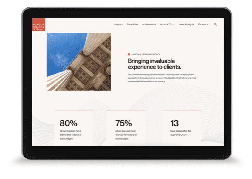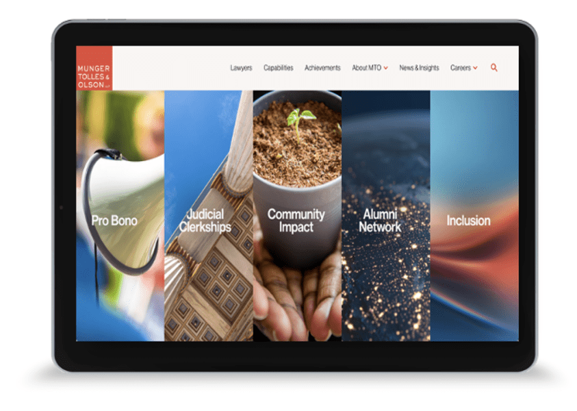 From Hollywood to Silicon Valley to Wall Street, Munger Tolles Olson (MTO) lawyers tackle the most high-profile cases. MTO’s work shapes the corporate/political landscape. The 200-lawyer firm has been named to the American Lawyer’s A-List 4 consecutive years and 11 times in the 21-year history of the award. The firm needed a new website and brand communications refresh to match its remarkable reputation. The old did not match the quality of the firm, its clients or work.