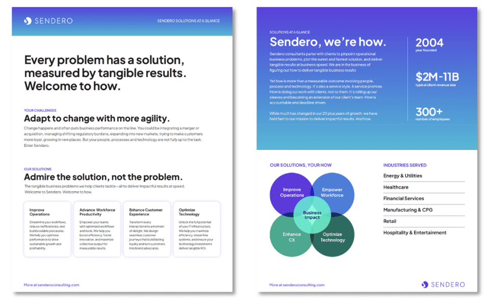 This large, national operational and technology consulting firm is growing exponentially. It serves Fortune 500 type organizations and now competes with first tier, better known firms for clients and talent. Yet it presented its offerings with mixed/unclear messaging, a dated look and feel in all communications, an aged-out hard to update website, and less than clear client offerings. The challenge is to improve all the above to sustain Sendero’s remarkable success in attracting high value clients, engagements and talent.