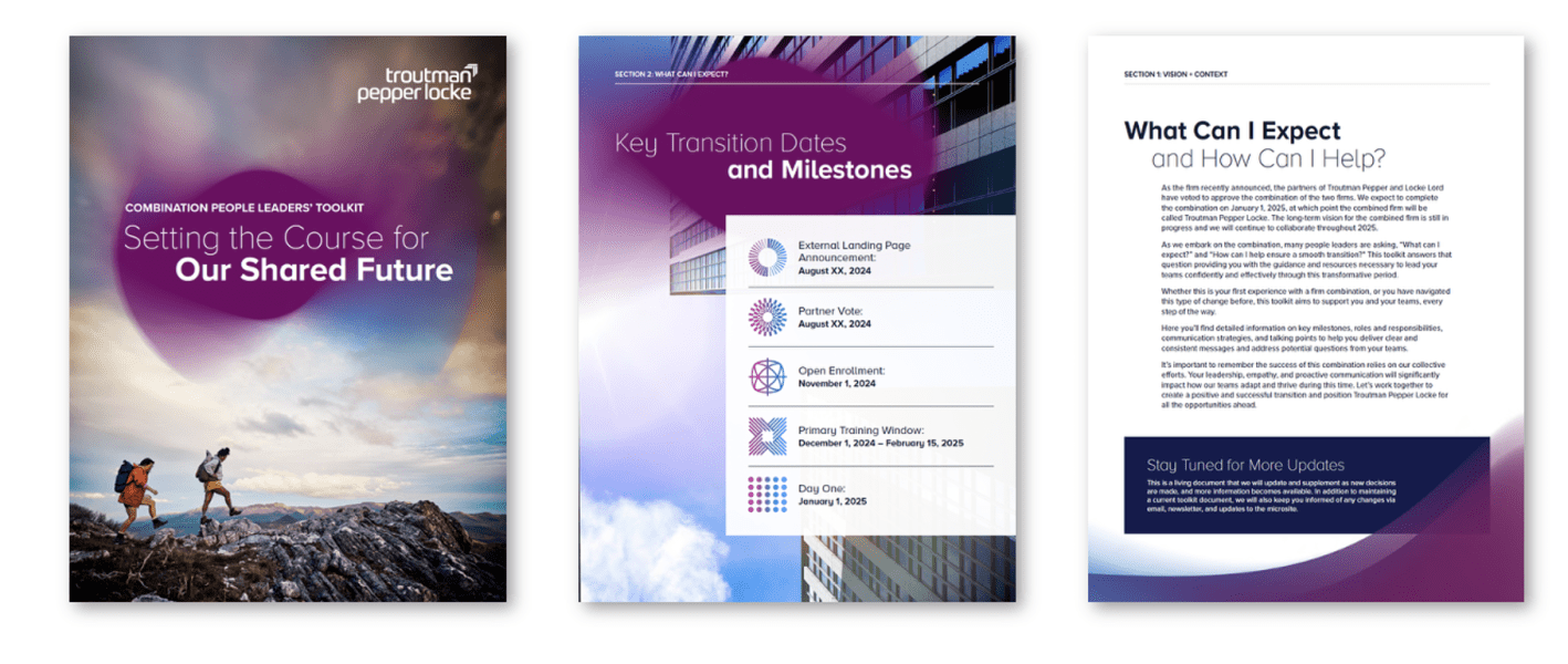 Two AMLaw 100 law firms became one top 30 international firm in a merger of equals with complimentary geographies, industries, cultures, client service approaches, and values. The challenge is to create a unifying identity, story and website drawn from the best of both legacy firms and their innovative client service experience model. And to explain the benefits of the combination to clients, recruits and the firm’s people.