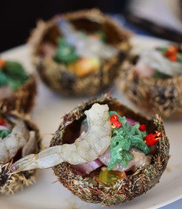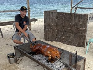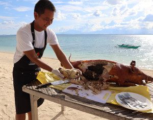 As we stepped off the boat into gentle turquoise tides washing up against our ankles, we were warmly welcomed by the tantalizing aroma of lechon slowly roasting over an open fire. Under a make-shift wooden and bamboo structure draped with white linens, Chef Mark Lobaton from Enting’s Special of Sagay was ready for us with a kinilaw demonstration using freshly caught Spanish mackerel, Indian mackerel, barramundi, and shrimp. Kinilaw is a traditional Filipino dish often compared to “ceviche.” It’s made by marinating raw fish or seafood in vinegar or citrus juice. It embodies the Filipino love for fresh ingredients, communal dining, and the use of local produce. Each region in the Philippines may have its own unique twist on kinilaw, showcasing the diverse culinary heritage of the country. Lobaton’s version is rooted in family tradition, using coconut vinegar as a dipping sauce, allowing the natural flavors and textures of the raw fish to shine.