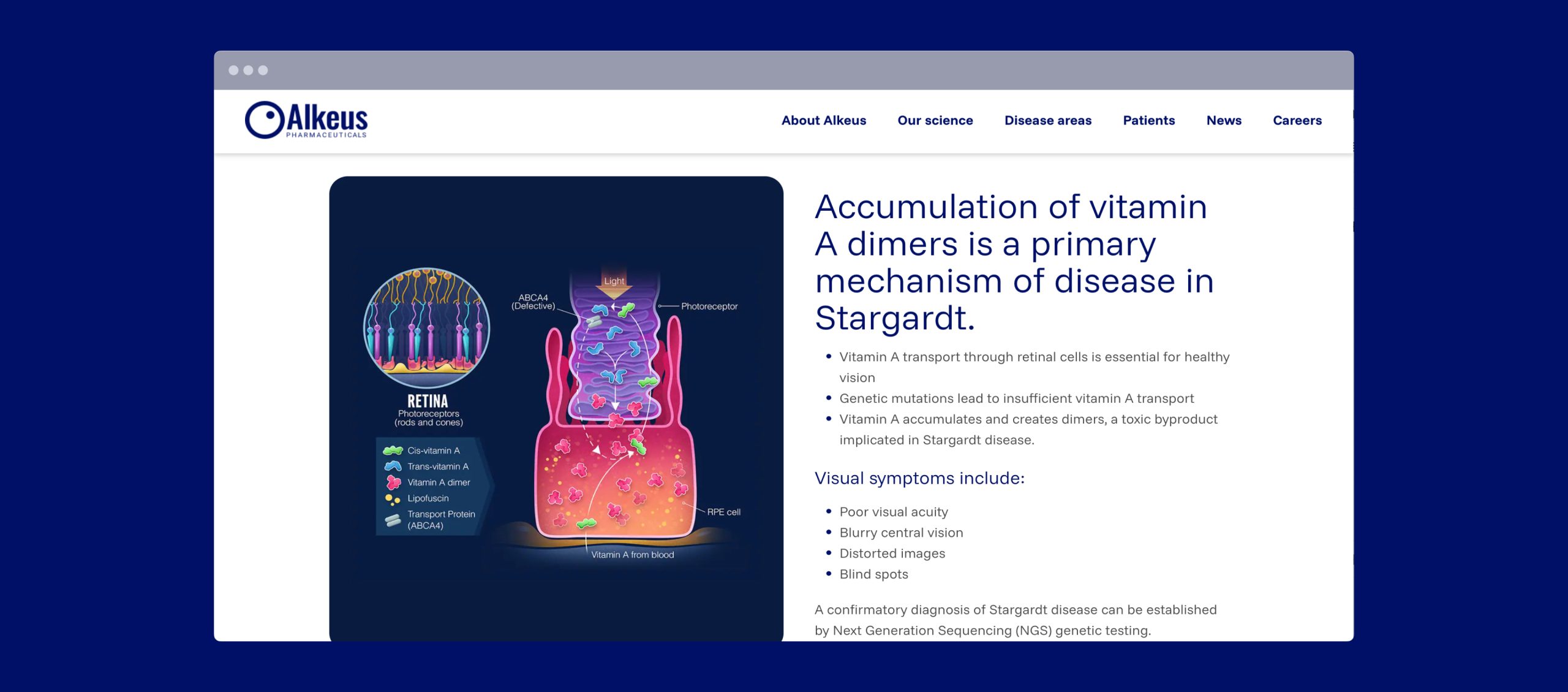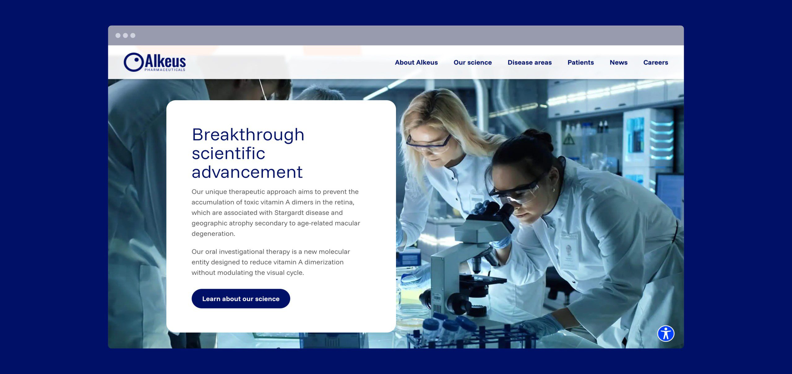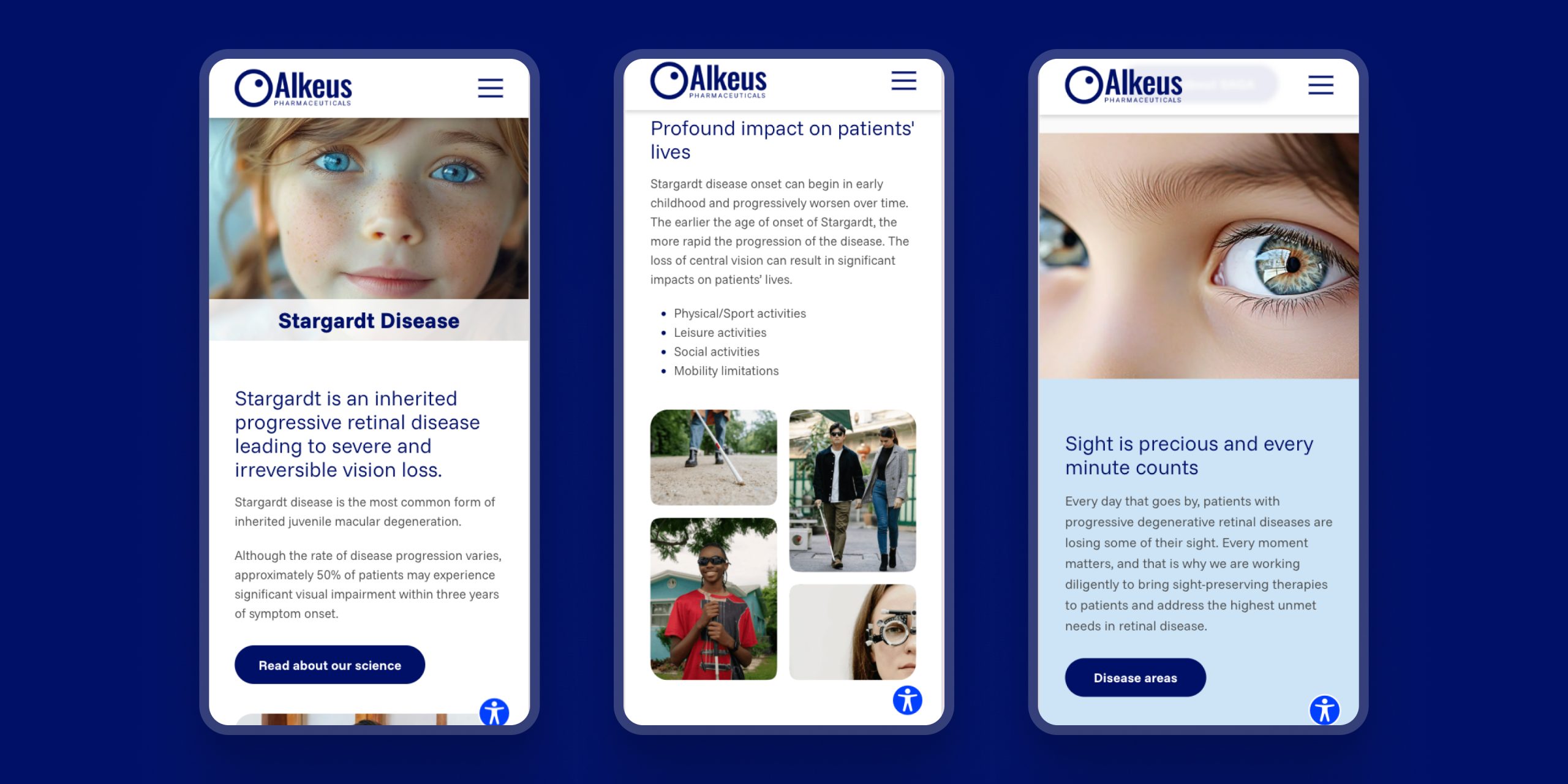 Our team provided a comprehensive, strategic approach to the Alkeus digital experience. From the initial conceptualisation to the final build, we were integral in shaping a user-centric platform that prioritises accessibility and clear communication. We worked in close partnership with the Alkeus team to ensure that the design and functionality of the Homepage and the Stargardt Disease page were not only aesthetically compelling but also scientifically sound and aligned with their critical mission.