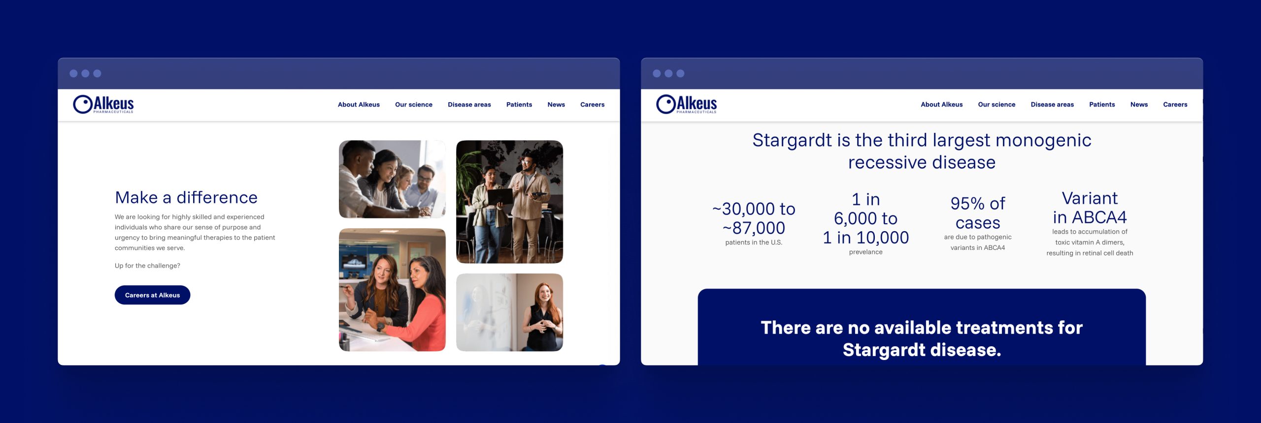 The Alkeus website redesign was a mission to bridge the gap between complex scientific research and a clear, accessible digital experience. Our project centred on transforming two critical landing pages, the Homepage and the Stargardt Disease page, into platforms that not only communicate Alkeus’s groundbreaking work but also serve as a reliable resource for patients, researchers, and partners. By refining the structure and elevating the design of these key entry points, we created an online presence that accurately mirrors the company’s commitment to precision and discovery.